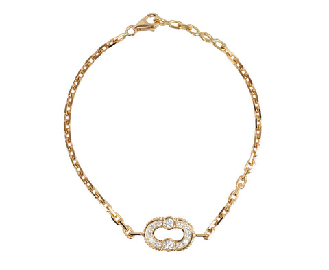 With its geometric, modern design and striking sparkle, this Viltier bracelet will be a future heirloom. Set at the center of the adjustable 18K yellow gold chain is a diamond encrusted 18K yellow gold charm. Representing two creative minds unifying in artistry, this bracelet looks stunning whether worn alone or layered.