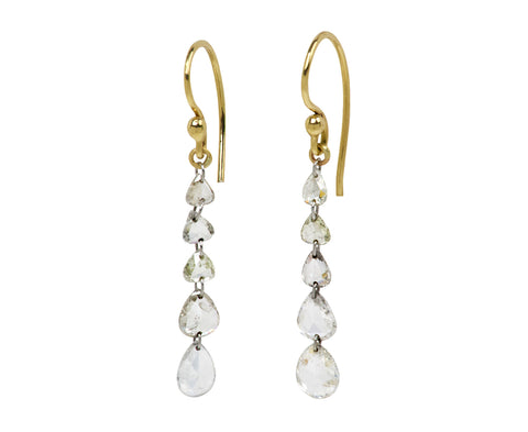With their understated sparkle and modern movement, these Todd Pownell earrings are a delicate cascade of rose cut diamonds. The five pear shaped stones taper in size and connect to one another by tiny platinum rings. They hang from 18K yellow gold ear wires.