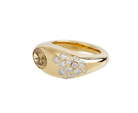 With an edgy sophistication and asymmetrical design, this one-of-a-kind Uniform Object ring is a striking alternative to a plain band. The wide, polished 18K yellow gold band is meticulously set with a large, oval champagne diamond on one end and a smattering of round, white diamonds on the other. Whether worn alone or added to a stacking collection, or even worn as a casual stand in for your wedding band, it exudes a striking elegance.