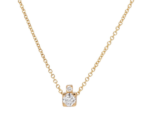 Stunning in its subtle sparkle and minimal design, this Sophie Bille Brahe necklace exudes a striking, modern sophistication. Two round, white diamonds are set together in 18K yellow gold pendants and hang along the 18K yellow gold chain. Perfect alone or layered with your other favorites.