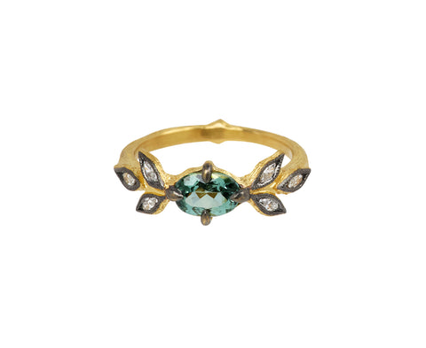 With its quiet sophistication and earthy color, this Cathy Waterman ring would be a stunning alternative to the traditional engagement ring. The pale green tourmaline is set in between three diamond marquise leaves framed in blackened 22K yellow gold and centered on the 22K yellow gold band.