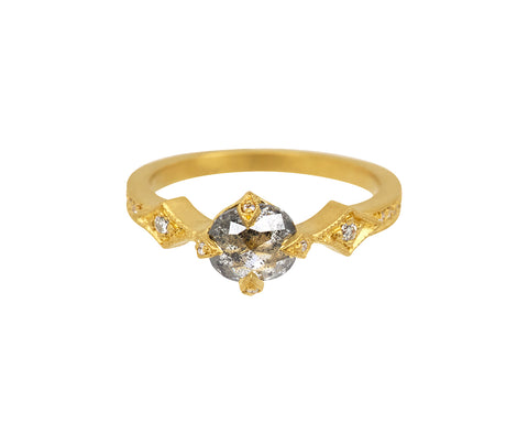 With its understated elegance, this Cathy Waterman ring has a vintage inspired design. The center silver diamond is covered in a surface of light reflecting facets to reveal natural tones of charcoal, cloud and silver. It is set in Cathy's signature 22K yellow gold and diamond antique prong setting with two side diamonds. The stunning combination is centered on the 22K yellow gold and diamond pavé band to create the perfect one-of-a-kind symbol of an engagement, commitment or other special occasion.