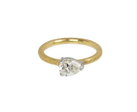 With its modern, earthy design, this Todd Pownell ring is a stunning alternative to the traditional diamond engagement ring. The pear shaped diamond is set east-west in platinum prongs and centered on the rounded 18K yellow gold hammered band. Alone or paired with one of Todd's gold bands, it is the perfect representation of a recent engagement, marriage or special occasion.