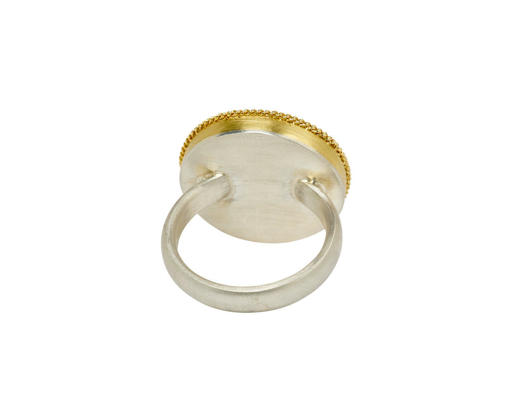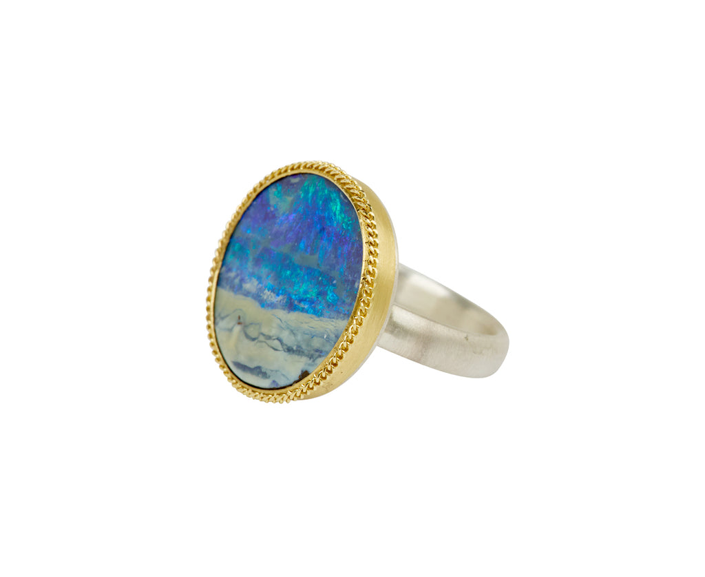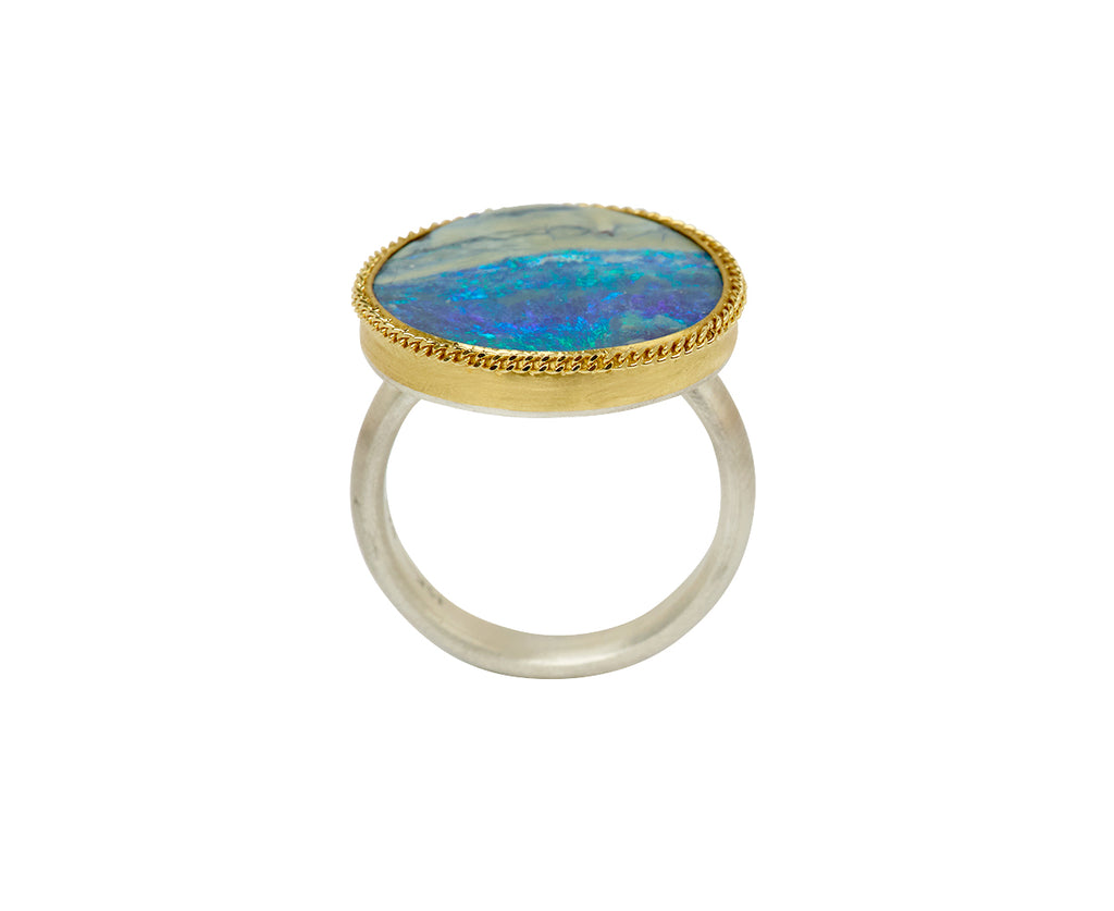 Stunning in its one-of-a-kind iridescence and color, this Amali ring has an otherworldly vibe. The smooth, circular boulder opal is set in a braided 18K yellow gold bezel and set at the center of the brushed sterling silver band. Where it as an exquisite, modern alternative to the traditional cocktail ring.