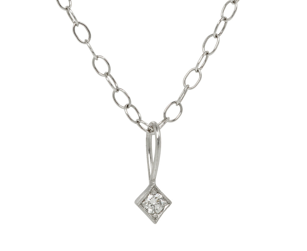 Minimal and easy-to-wear, this Cathy Waterman charm would look perfect hanging from any of your favorite chains. The diamond shaped platinum pendant has a round, white diamond at its center and hangs from the large platinum bale. Add it to a cluster or wear it on its own.