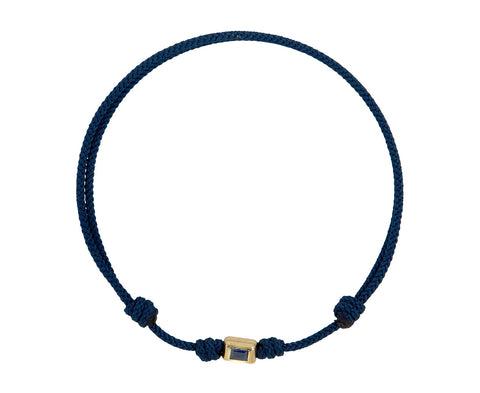 This Luis Morais bracelet is perfect for everyday. The 14K yellow gold charm is set with a blue sapphire baguette and knotted at the center of a navy blue nylon cord. Adjust the bracelet to fit with the double-knot strands and add it to a stacking collection of your favorites.