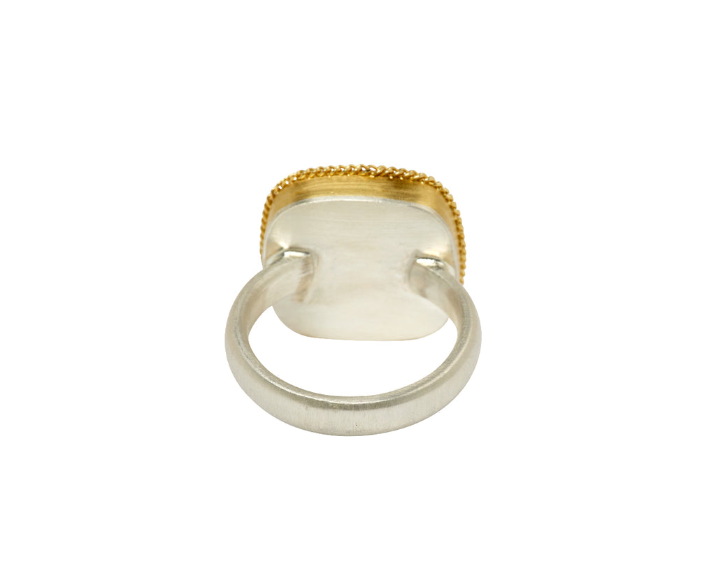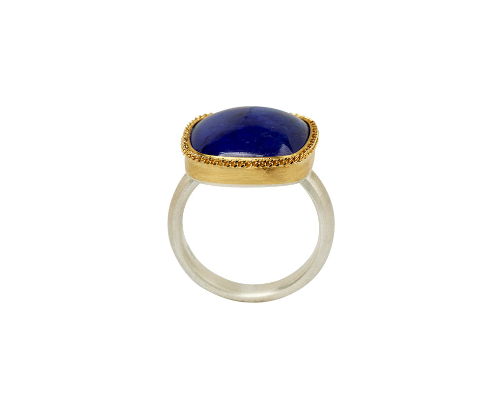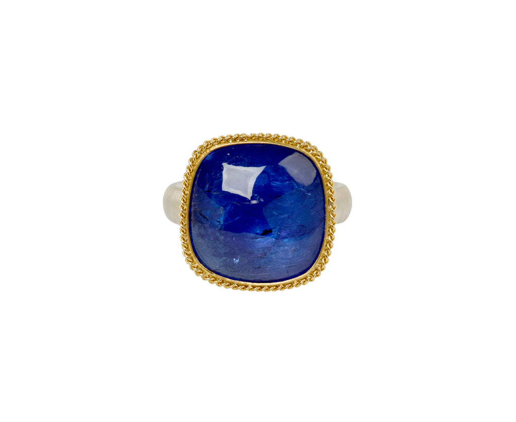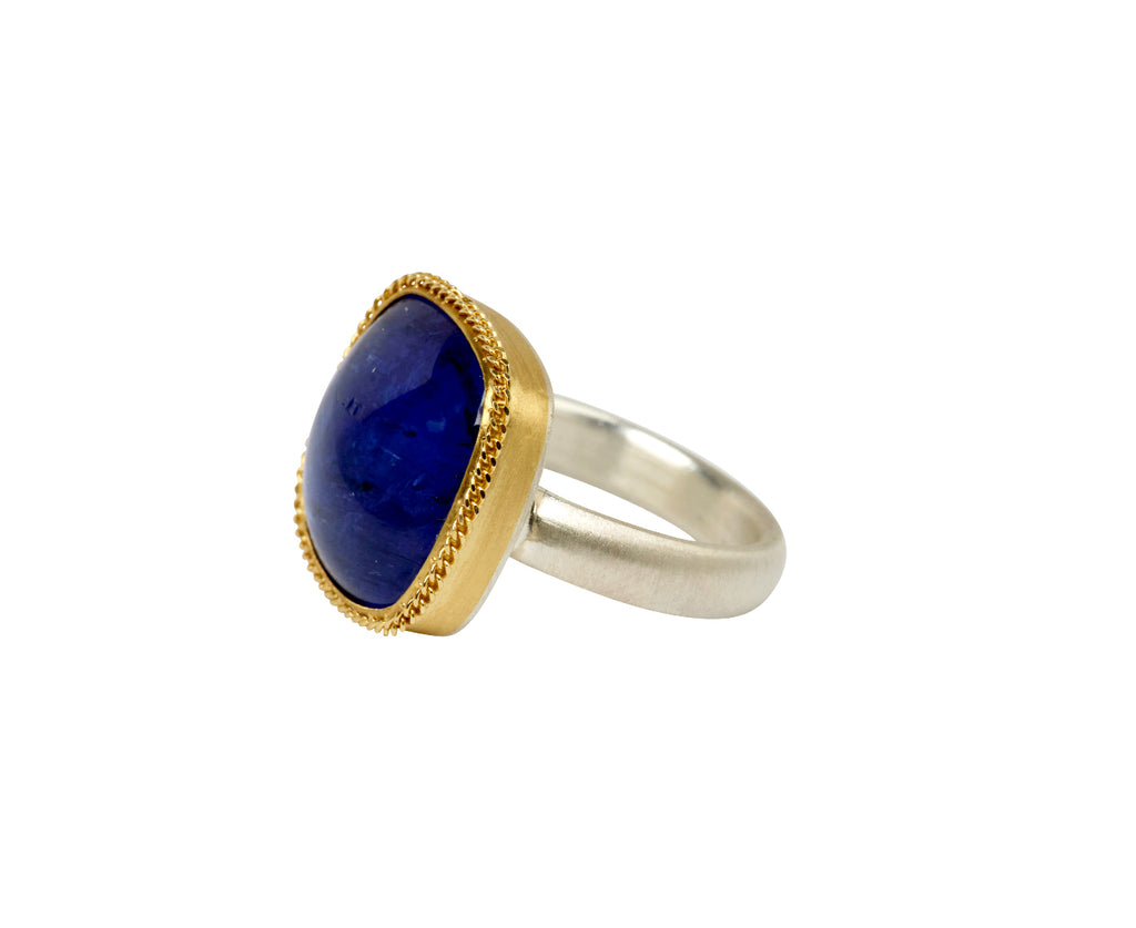 With a gorgeous, cool toned color story, this Amali ring has a stunning, restrained luxury. The square cabochon tanzanite reveals the natural characteristics of the stone. It is set in a hand wrought braided frame of 18K yellow gold with detailed granulation and centered on the brushed sterling silver band. Wear this as a modern alternative to the traditional cocktail ring.
