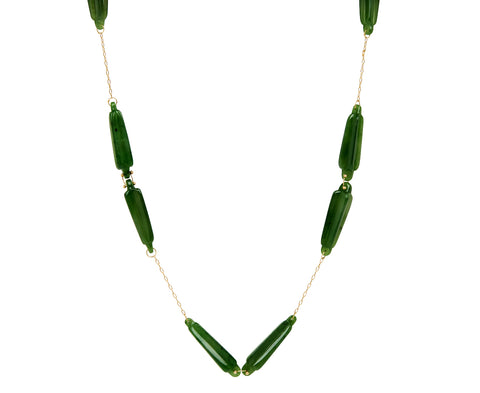 With its warm green color and hand cut details, this Ten Thousand Things necklace is a stunning collection of hand cut stones. Three dimensional jade links are connected in pairs with tiny gold pins along a delicate handmade chain that closes with Ten Thousand Things' signature hook and eye clasp.