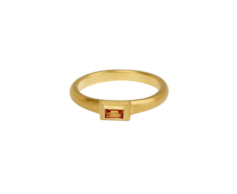 Perfectly balancing statement-making design with a subtle scale, this LFR Studios ring looks amazing from every angle. The fairmined 22K yellow gold rectangular ring face has been set with a rectangular orange sapphire at its center. The rectangular ring face is set at the center of the matte, 22K yellow gold band.