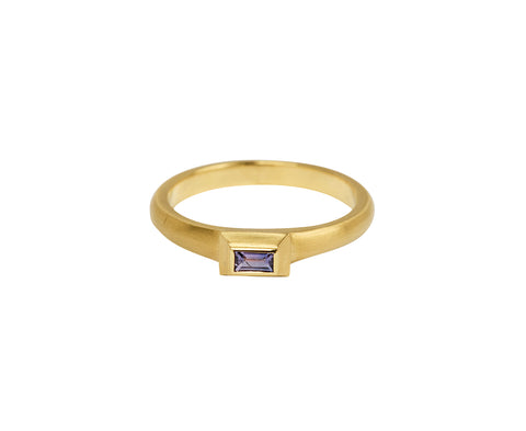 Sweet in scale and perfectly balancing warm toned gold and cool toned color, this LFR Studios ring can be worn alone or stacked. The rectangular PURPLE sapphire is set in a 22K yellow gold rectangular ring face at the center of the matte 22K yellow gold band.