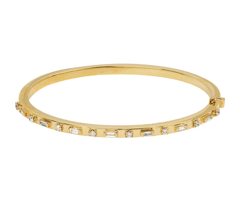Add a hint of texture and shimmer to your stack with this stunning, classic Sorellina bracelet. The square-edged polished 18K yellow gold bangle has an alternating pattern of round and baguette white diamonds set along its front. It closes with an 18K yellow gold safety clasp.