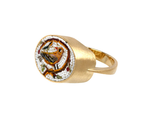 Statement-making in its sweet, earthy design and hand-crafted details, this Le Sibille ring is a stunning take on the traditional cocktail ring. Each of the tiny micromosaic pieces has been laid in the elevated 18K yellow gold ring face to create a pale brown sparrow perfectly perched on a tree branch. It's centered on the matte 18K yellow gold band and begs for a closer look.