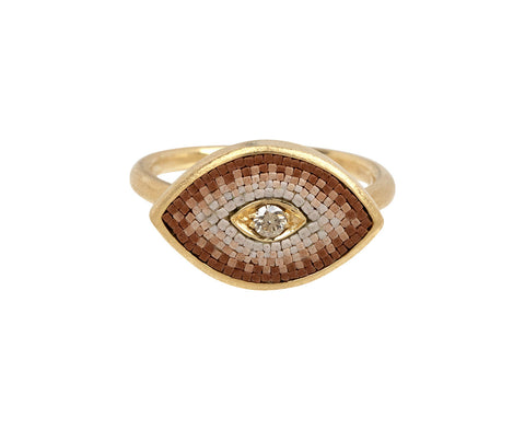 Breathtaking in its intricate design and stunning details, this Le Sibille ring is an absolute work of art. The tiny micromosaic tiles have each been laid by hand in the closed back 18K yellow gold bezel to create a subtle evil eye surrounding the shimmering pale brown diamond. It's centered on the matte 18K yellow gold band and begs for a closer look.