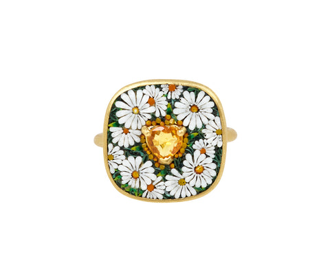 With its sweetly feminine vibe and ancient technique, this Le Sibille ring has been painstakingly hand-crafted. The soft square ring face has been set with green, orange and white micromosaic pieces to create the tiny, bright white daisies. It surrounds a round yellow sapphire set in tiny 18K yellow gold prongs directly at the center. The stunning composition is centered on the matte 18K yellow gold band.