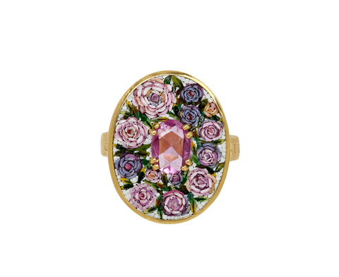 Statement-making in scale and feminine in design, this Le Sibille ring has been painstakingly hand-crafted. The large, oval ring face has been set with green, blue, pink and white micromosaic pieces to create the tiny pink roses and leaves. It surrounds an oval pink sapphire set in tiny 18K yellow gold prongs directly at the center. The stunning composition is centered on the matte 18K yellow gold band.