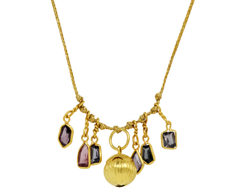 Its jewel-toned color and bohemian design give this stunning Pippa Small necklace its effortless versatility. The cool toned, asymmetrical spinel are set in 18K yellow gold and individually knotted along the center of the braided golden cotton wax cord on either side of the large 18K yellow gold bell. Wear it alone or with a layered collection of your favorite necklaces.