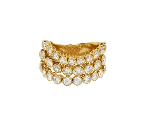 This bold, fluid and sparkling ONDYN diamond ring is a stunning alternative to a wedding or cocktail ring. The sparkling white diamonds are individually set in bezels of 18K yellow gold are linked together to create three articulated rows. Finished in the back with a slightly curved wide 18K yellow gold band this is a ring that moves with you.