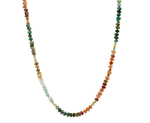 This festive Lena Skadegard necklace adds a playful elegance to any collection. Each of the faceted and smooth beads of emerald, aquamarine, sunstone and agate are individually knotted along the cord. Shimmering with a gorgeous landscape of greens, salmon and pale blues, this multi gem necklace has an earthy peaceful presence. Beads of faceted 18k yellow gold are interspersed throughout the composition to add a beautiful contrast. Finished with a 9K yellow gold hook and eye clasp closure. Perfect alone, it also looks great layered!