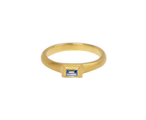 Sweet in scale and perfectly balancing warm toned gold and cool toned color, this LFR Studios ring can be worn alone or stacked. The rectangular blue sapphire is set in a 22K yellow gold rectangular ring face at the center of the matte 22K yellow gold band.