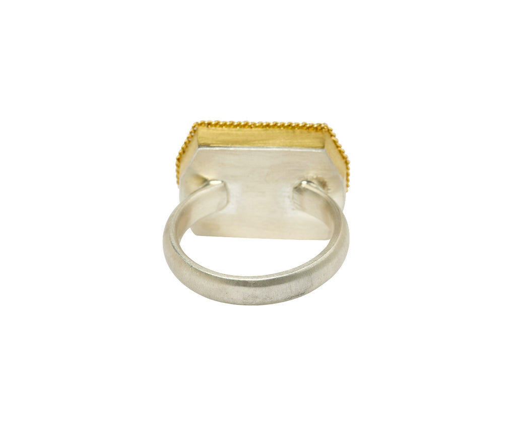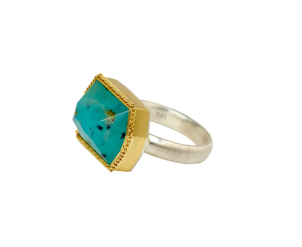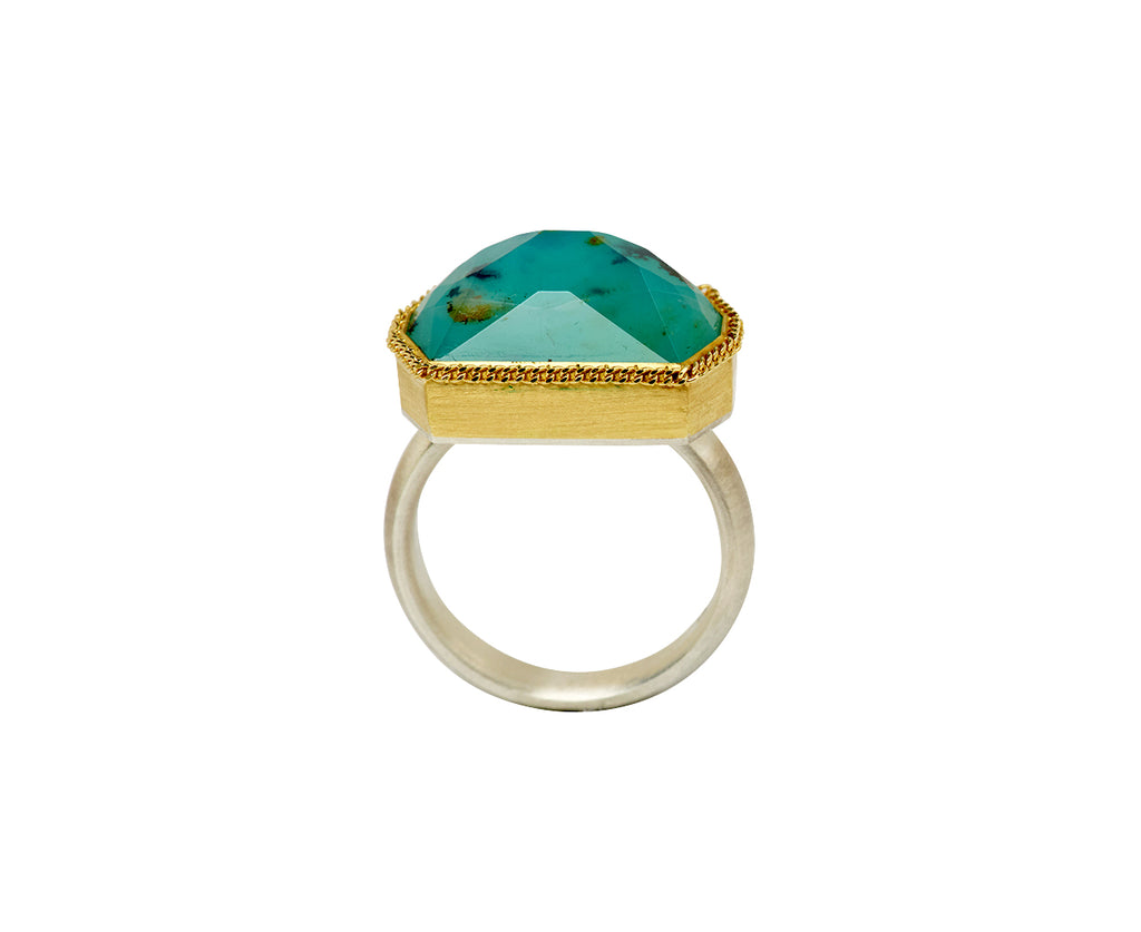 This stunning, one-of-a-kind Amali ring has a statement-making color and natural characteristics. The teal Peruvian opal has a surface of facets highlighting its natural color and hints of dark matrix. The horizontally set stone is framed in a granulated 18K yellow gold setting and centered on the matte sterling silver band.