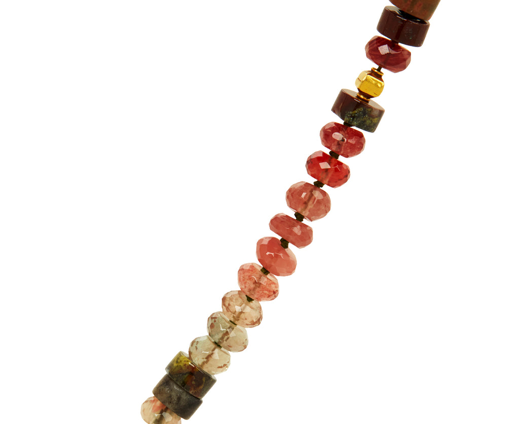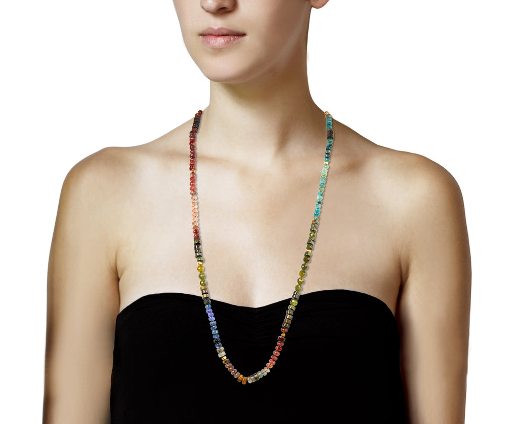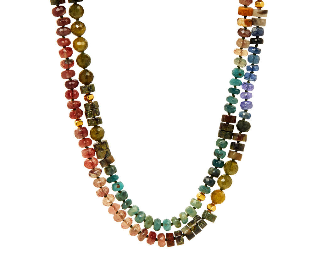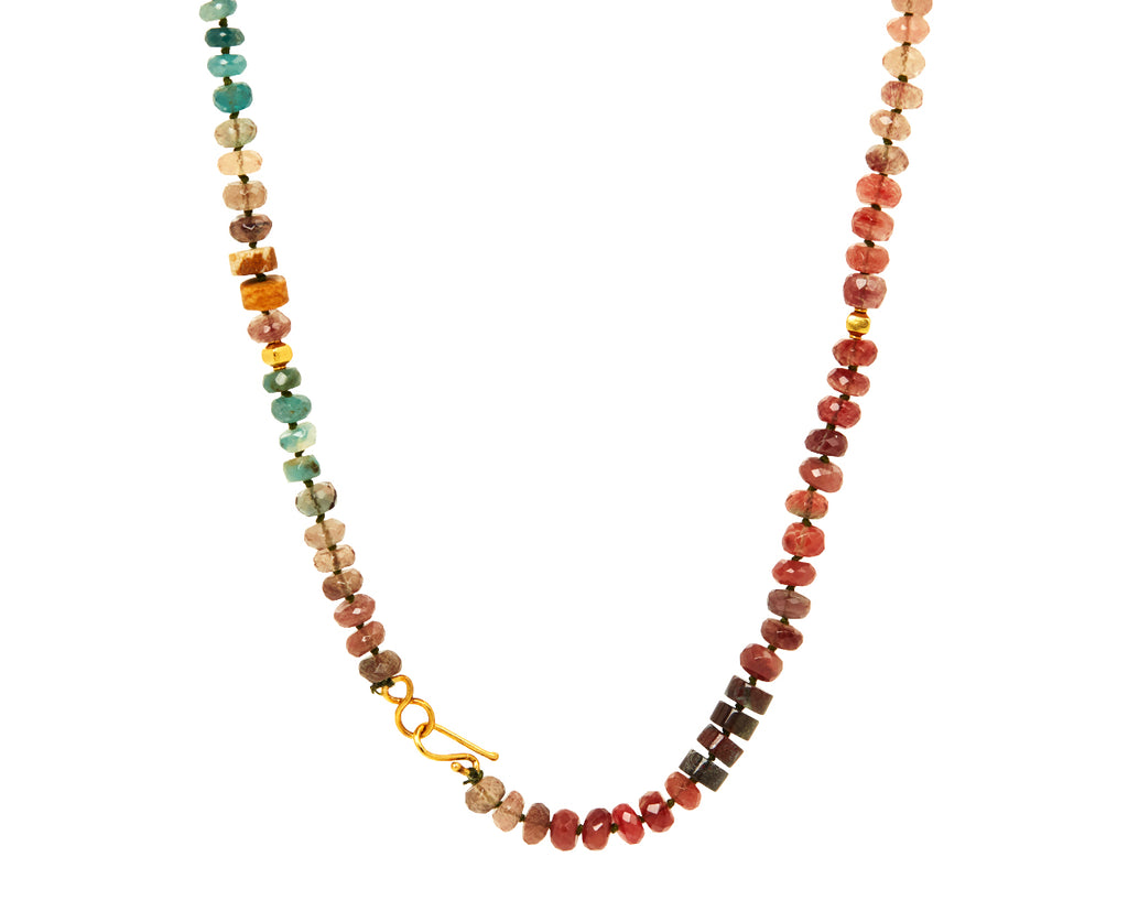 This festive Lena Skadegard necklace adds a bold elegance to any collection. Each of the faceted and smooth beads of moss aquamarine, kyanite, andalusite, grossular garnet, tanzanite, tourmaline and agate are individually knotted along the cord. Shimmering with a gorgeous landscape of greens, reds and earth tones, this multi gem necklace has a peaceful presence. Beads of faceted 18k yellow gold are interspersed throughout the composition to add a beautiful contrast. Finished with an 18K yellow gold hook and eye clasp closure. Perfect alone, it also looks great layered!