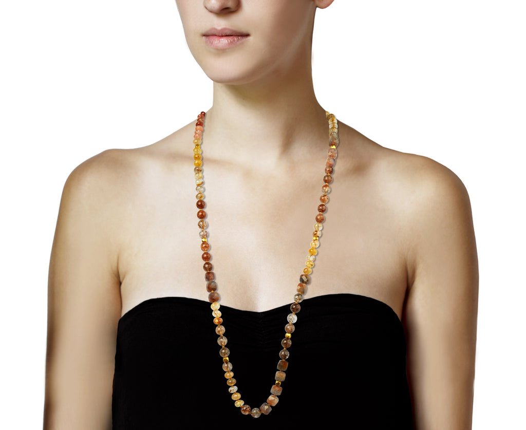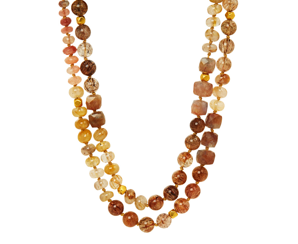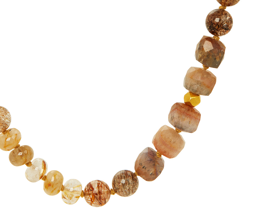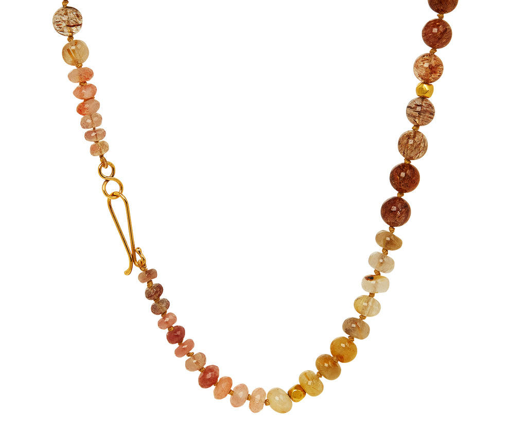 This festive Lena Skadegard necklace adds a bold elegance to any collection. Each of the faceted and smooth beads of gold and black rutilated quartz, sunstone,