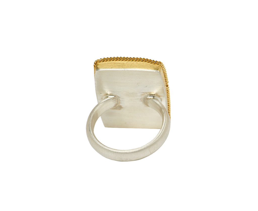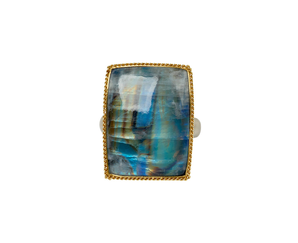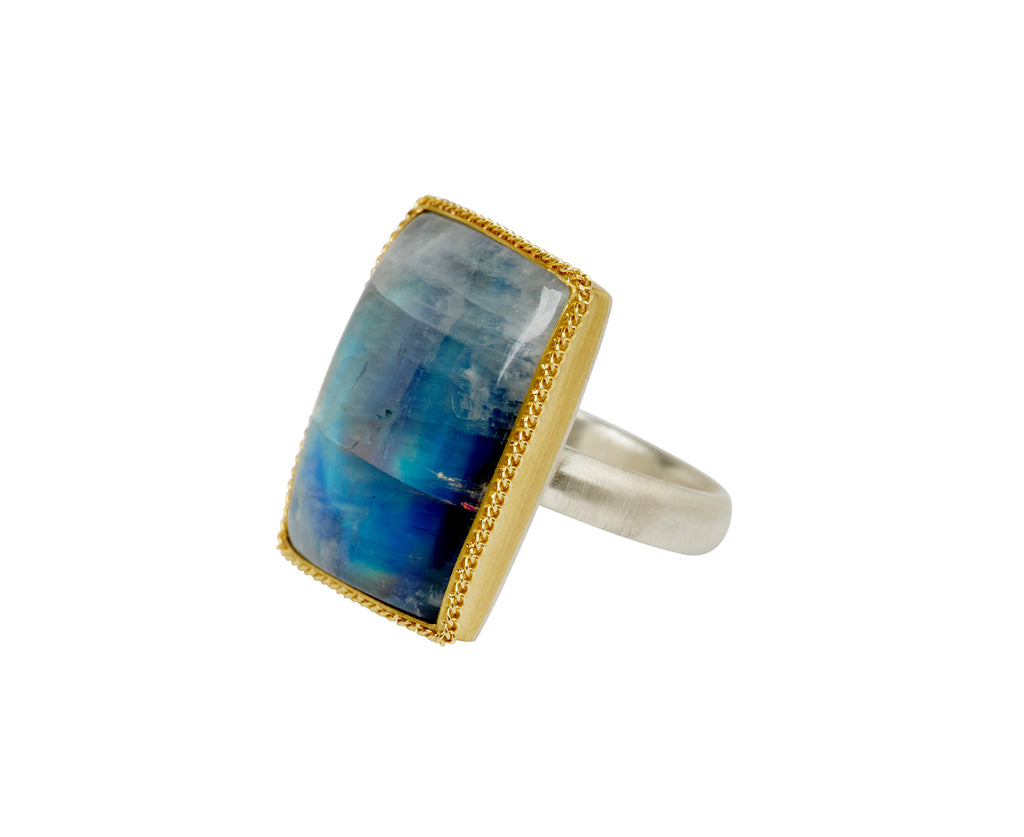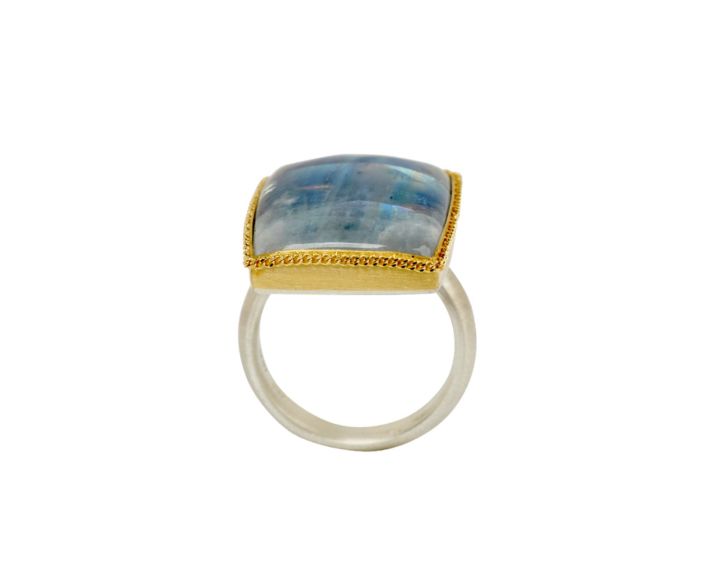 Stunning in its intense iridescence, this Amali ring seems to glow from within. The smooth rectangle of iridescent moonstone is set in granulated 18K yellow gold setting and set at the center of the brushed sterling silver band. Where it as an exquisite, modern alternative to the traditional cocktail ring.