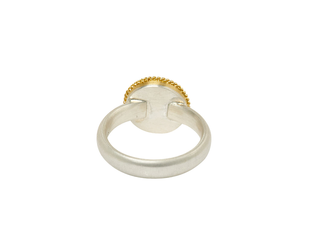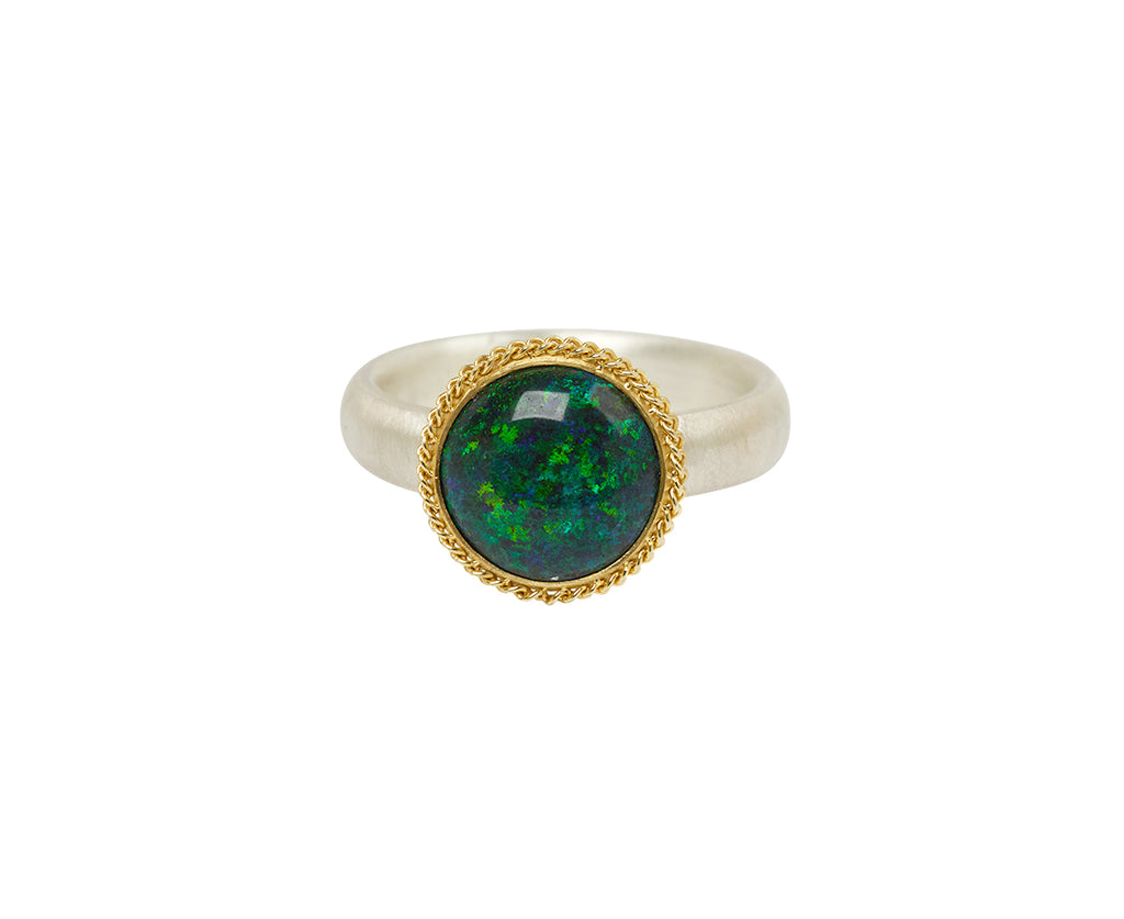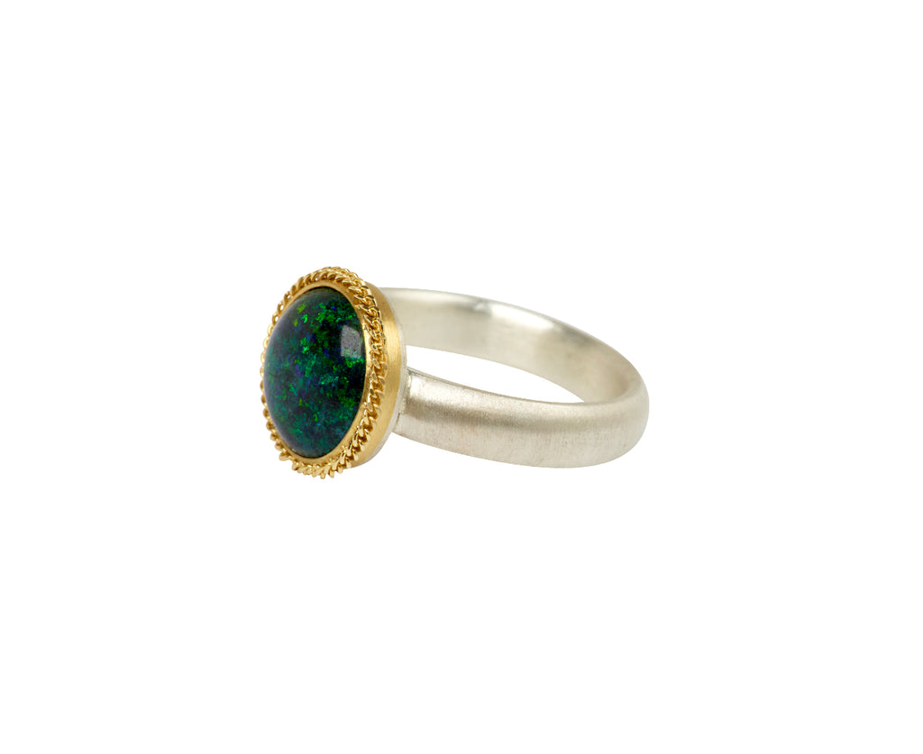 Stunning in its intense iridescence, this Amali ring subtly glows from within. The smooth circle of andamooka opal is set in a meticulously hand fabricated setting of 18K yellow gold and set on the brushed sterling silver band. Where it as an exquisite, modern alternative to the traditional cocktail ring.