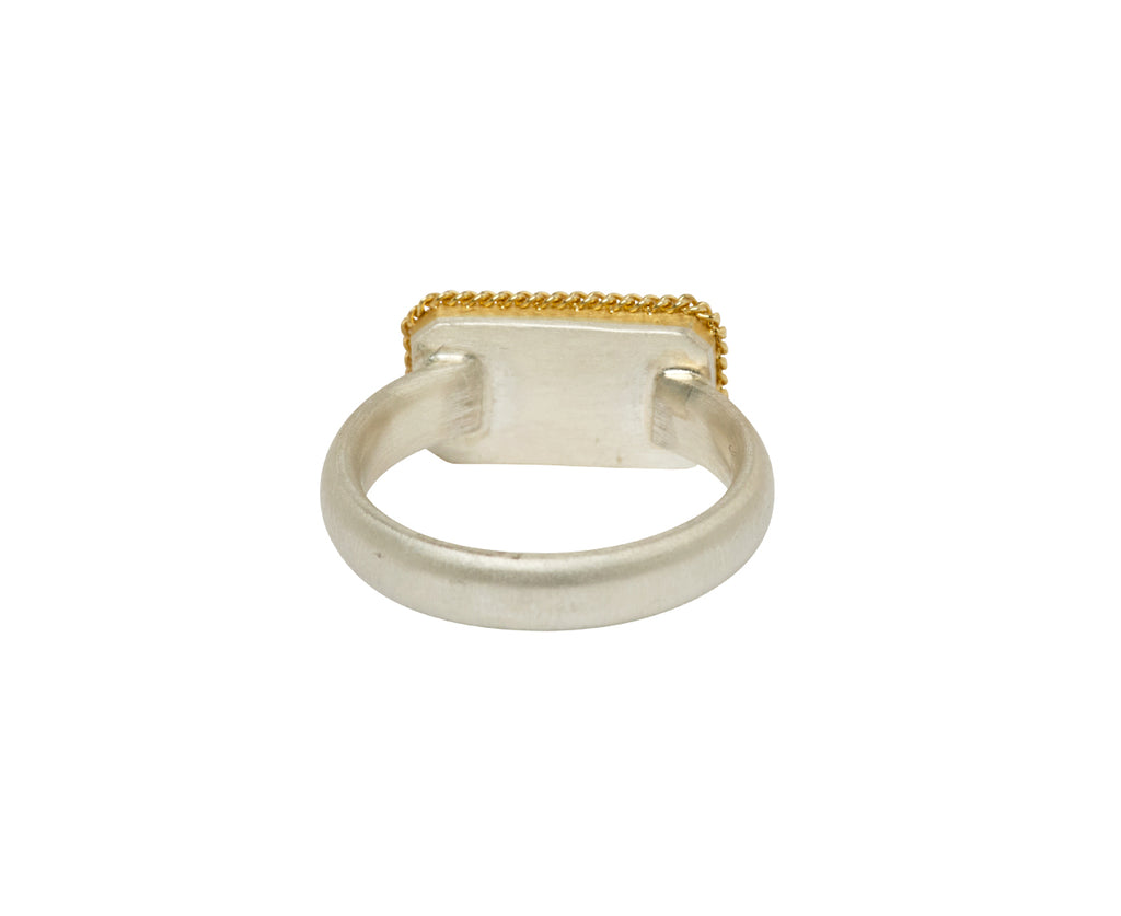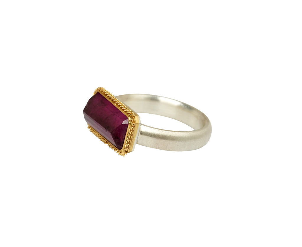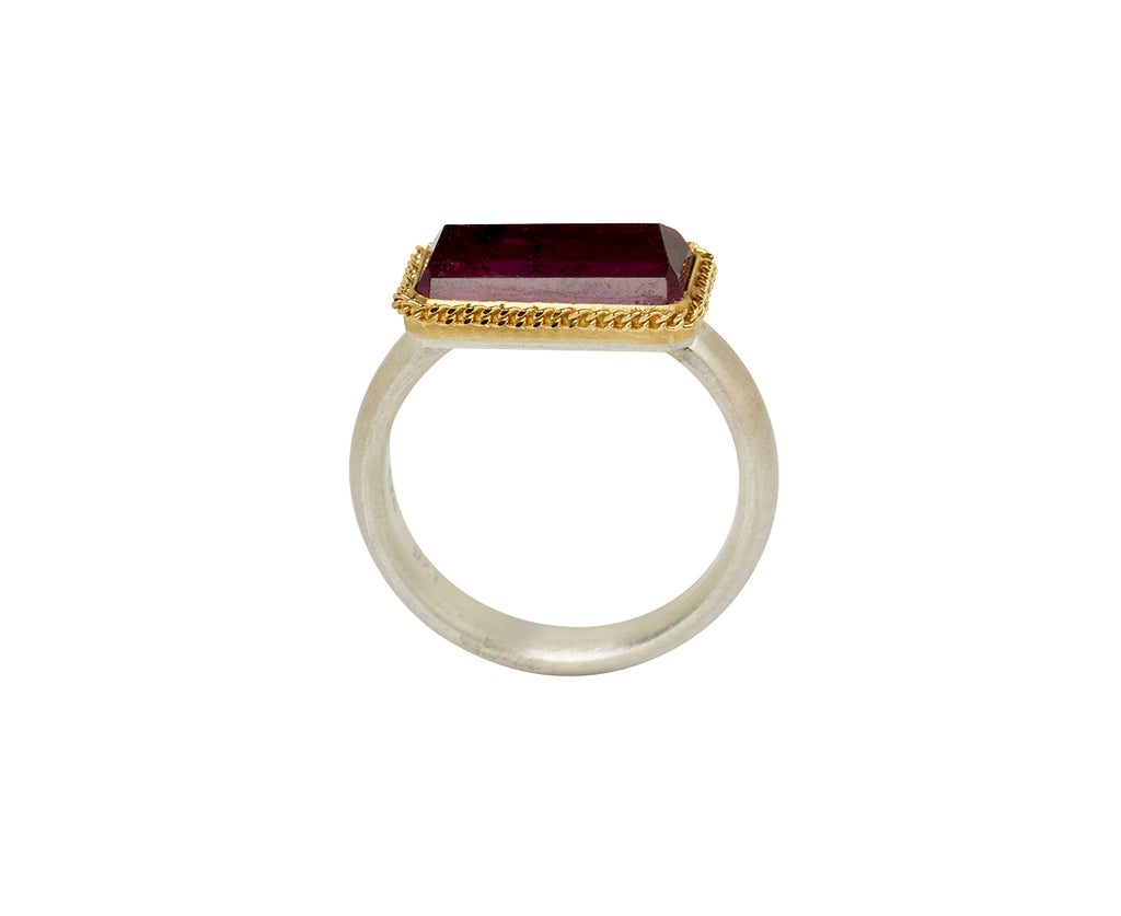 Stunning in its feminine shade of pink, this Amali ring is a statement-making alternative to the traditional cocktail ring. The rectangular, inverted magenta tourmaline has a captivating quality. It is framed in an 18K yellow gold braided bezel and centered on the matte sterling silver band.