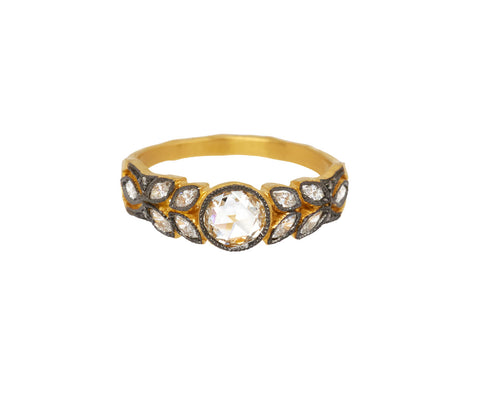 With a stunning combination of diamonds and high karat gold, this Cathy Waterman ring has a breathtaking presence. The round, white rose cut diamond is covered in a surface of light reflecting facets and nestled in a setting of 22K blackened yellow gold at the center of the garland of marquise diamonds. The composition is centered on the hammered 22K yellow gold band.