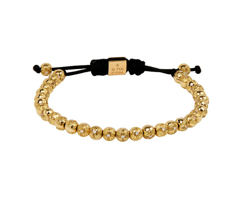 Inspired by the prayer beads of many cultures, this Shamballa Jewels bracelet has an earthy luxury. Each round, signature 18K yellow gold beads is set with a single diamond and stamped with the Shamballa star. Strung along the black nylon cord, it can be adjusted by pulling the double round beads held by the signature square lock bead.