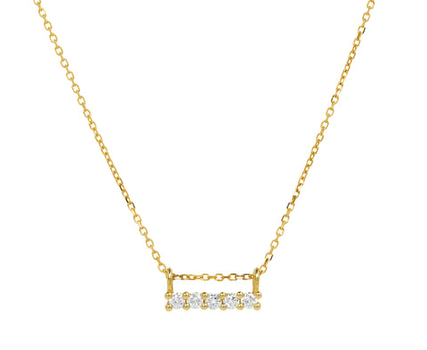 With its subtle sparkle and delicate style, this stunning Jennie Kwon necklace is all about its quiet restraint. The five round, white diamonds are held by tiny 14K yellow gold prongs. The stones hang at the base of the 14K yellow gold chain to create the perfect addition to your layered necklace collection.
