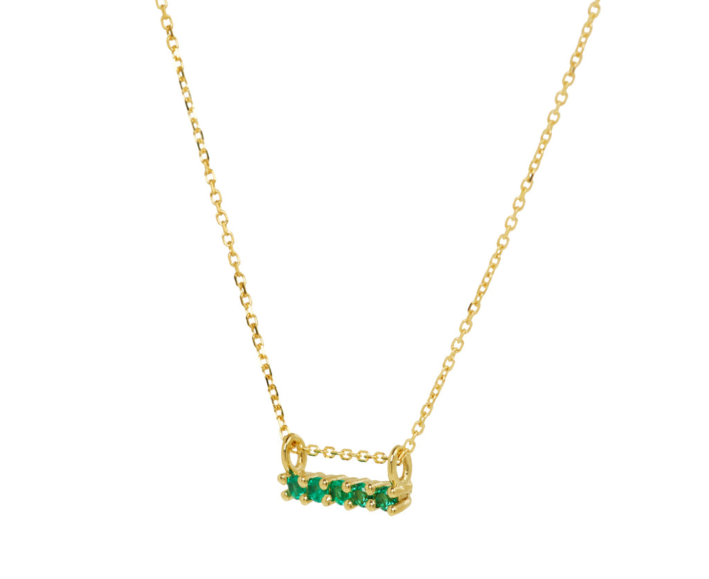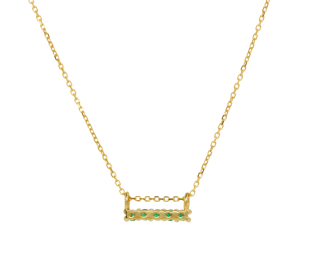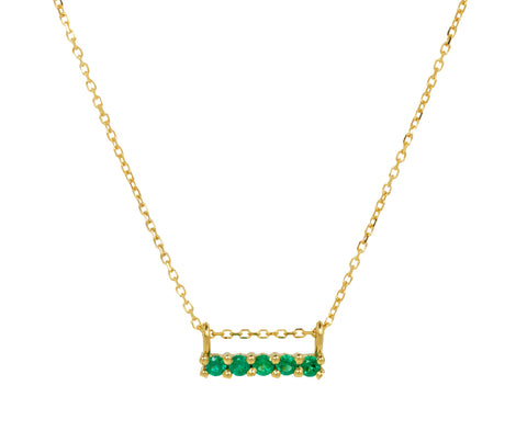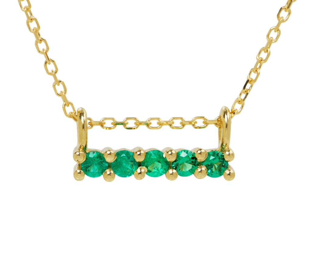 With its cool toned color and delicate style, this stunning Jennie Kwon necklace is all about its quiet restraint. The five round, emeralds are held by tiny 14K yellow gold prongs. The stones hang at the base of the 14K yellow gold chain to create the perfect addition to your layered necklace collection.