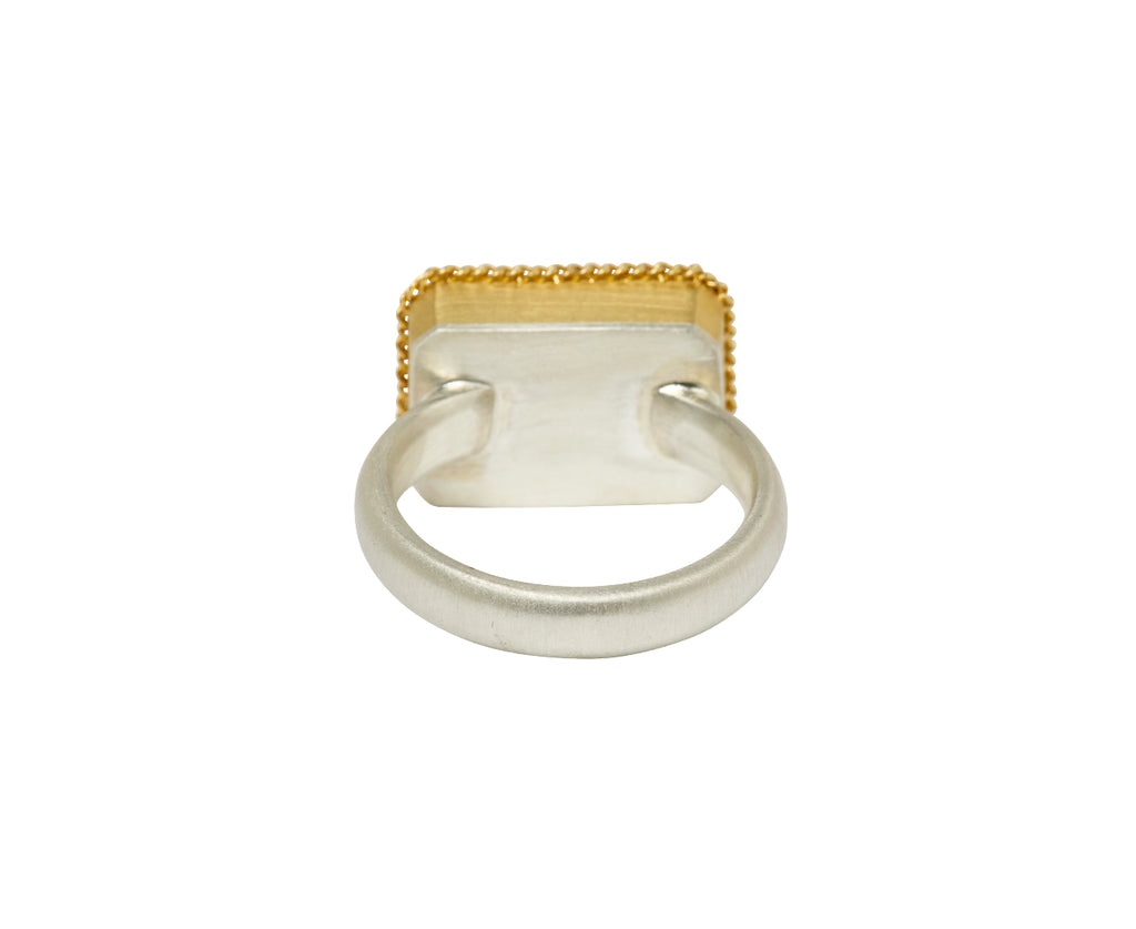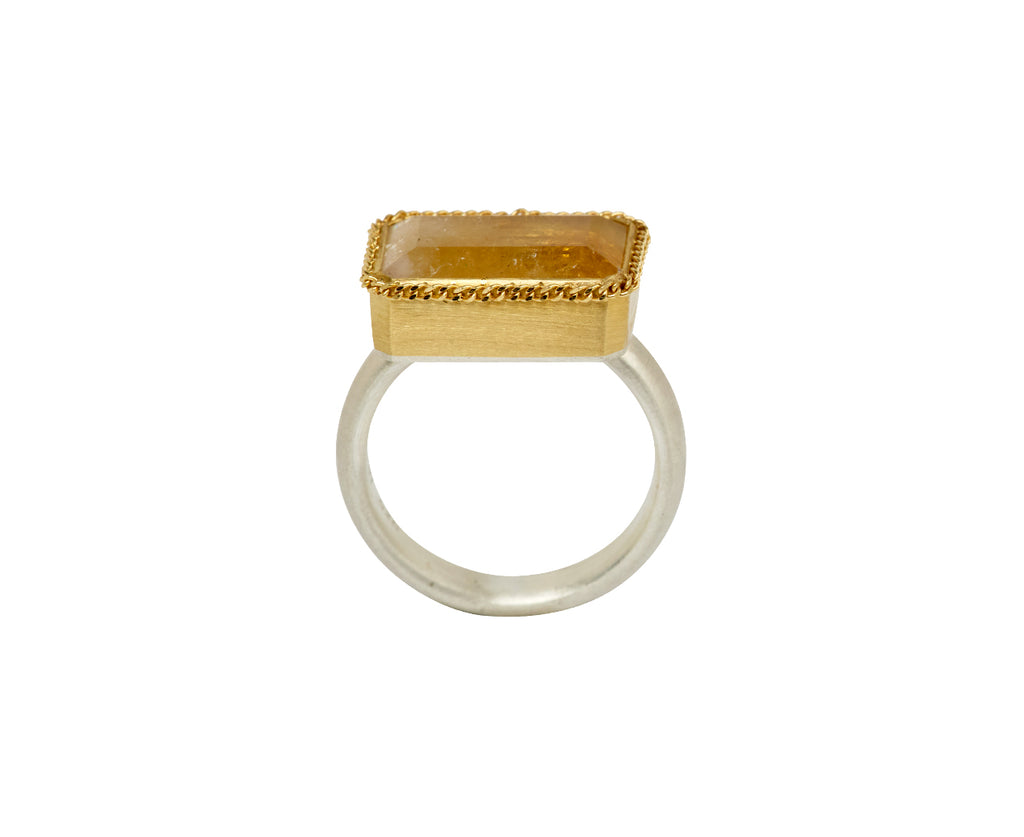 With its warm combination of honey yellow and rich gold, this Amali ring has a restrained luxury. The rectangular citrine is covered in a surface of subtle, light reflecting facets that reveal the natural beauty of the stone. It is set in a hand wrought braided frame of 18K yellow gold and centered on the brushed sterling silver band. Wear this as a modern alternative to the traditional cocktail ring.