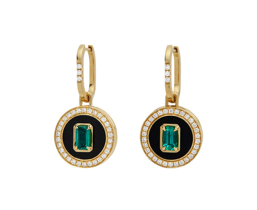 Inspired by the first American woman to sail around the world, these State Property earrings perfectly balance color and shimmer. The 18K yellow gold huggie hoops have three white diamonds set on their front surface and connect to 18K yellow gold latch backs. A round 18K yellow gold drop has a prong set emerald at its center surrounded by black onyx inlay and round, white diamonds. The drops hang from the hoop, although they can easily be slid off.