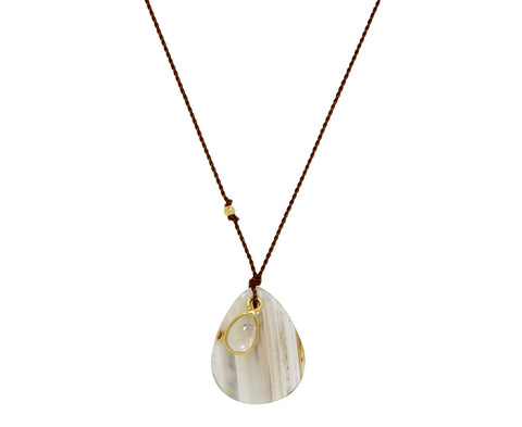 Earthy and elemental, this Margaret Solow necklace is a cool, quiet and surprisingly versatile addition to any jewelry collection. The duo of pendants - a pale agate and an 18K gold bezel set shimmering rainbow moonstone are knotted at the base of an espresso brown nylon cord. Wear this alone, or layer it with your other favorites for a modern, bohemian look.