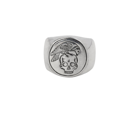 The perfect, bold and striking size, this Digby & Iona signet ring is a modern version of the traditional. The sterling silver ring is engraved with a bird perched on top of a skull, reminding us of the fact that one day we all will die.