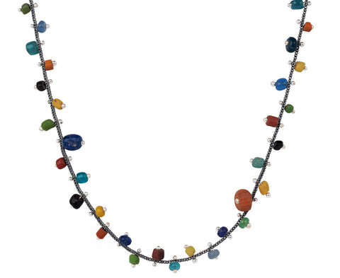 From the quiet and enigmatic collection of Ten Thousand Things comes their classic Ancient Bead Necklace using beads that were once used for trading in Asia. The muted, multi-colored beads are studded at 1/4" intervals along a pale silver foxtail chain. Fastens with a smooth, hand-finished toggle closure.