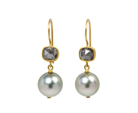 Perfectly combining classic materials with edgy style, these Mallary Marks earrings have an understated elegance. The soft square salt and pepper diamonds are encased in bezels of 22K yellow gold and attach to 18K yellow gold ear wires. Luminous gray Tahitian pearls anchor the double stone composition.
