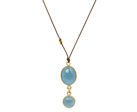Earthy and cool, this Margaret Solow necklace is the perfect addition to a casual, earthy collection. A duo of cabochon aquamarine framed in a thin band of 18K gold hang at the center of an espresso colored nylon cord with a singular faceted gold bead set asymmetrically on one side.