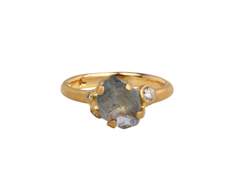With an earthy elegance and stunning sparkle, this Johnny Ninos solitaire is a striking, modern alternative to the traditional engagement ring. Nestled in a molten prong setting of 18K yellow gold is an asymmetrical aqua colored, untreated Montana sapphire. A scattering of various sized white brilliant cut diamonds surround the center stone. As stunning as it is edgy and contemporary, it also exudes a confident sense of style.