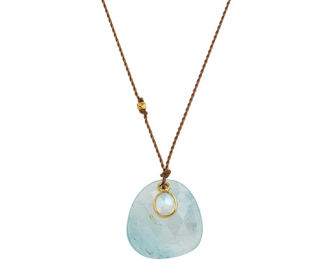 With a quiet, earthy elegance and calm, cool-toned color story, this Margaret Solow necklace is the perfect necklace to pair with any casual outfit. The faceted blue aquamarine acts as a backdrop for the smaller cabochon moonstone framed in 18K yellow gold. They hang together from the center of the nylon cord.