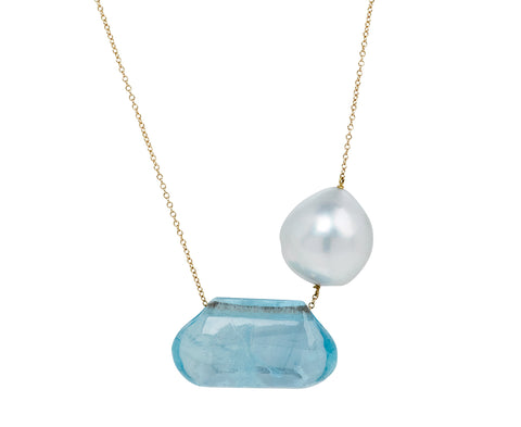 With its modern, sculptural vibe, this TenThousandThings necklace makes a striking alternative to the traditional bead pendant. The smooth, oblong pale blue aquamarine slides along the 18K yellow gold chain beside the stationary, natural pearl. Alone or layered with your other favorites, it exudes a bold sophistication.
