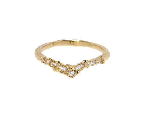 With its subtle sparkle and handcrafted design, this Ellis Mhairi Cameron ring has an understated elegance. The alternating round and baguette diamonds are set side by side in a V shape at the center of the thin, polished 14K yellow gold band. Wear it with one of her solitaires or add it to a stacking collection.