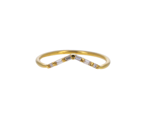 Add this baguette diamond Artëmer ring to your stacking collection or pair it with a diamond solitaire for an understated wedding ring. Shimmering white diamonds are individually set along the front surface of the thin, 18K yellow gold V-shaped band.
