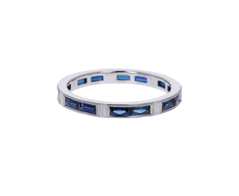With a classic, detailed elegance and pop of cool toned color, this finely handcrafted sapphire band by Erika Winters exudes a timeless style. The platinum ring is set with seven stations of custom French cut blue sapphire baguettes with a subtle textured line dividing each station. Wear it to symbolize a wedding, anniversary or another special occasion.