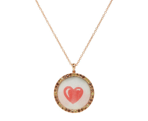 Perfectly sweet with its warm toned colors and playful design, this Francesca Villa necklace is perfect for everyday. The vintage varivue lenticular lens changes with every move to show different red hearts on either side. It's framed by round yellow sapphires that vary slightly in tone. It hangs from the center of the 18K pink gold chain and begs for a closer look!