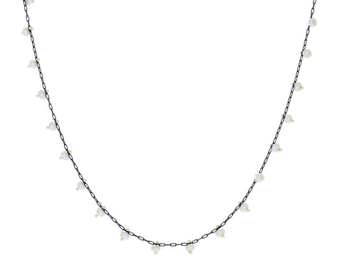 From the quietly elegant jewelry collection of Ten Thousand Things comes a modern classic. Tiny, white pearls are intricately connected to the black oxidized silver chain at half inch intervals with 18 karat bead bars.