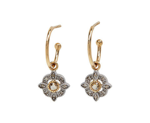 With a casual elegance and hint of sparkle, these Pascale Monvoisin earrings make an easy addition to your jewelry rotation. Hanging from the 9K yellow gold hoops are sterling silver drops set with tiny diamonds that surround a larger diamond set in 9K yellow gold. These earrings are an instant modern heirloom and very easy to wear with just about anything!