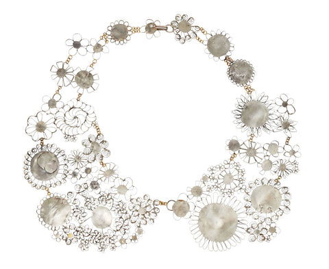 Inspired by blossoming flowers, this Judy Geib necklace is a breathtaking necklace echoing sweet, floral shapes. The sterling silver necklace also replicates the shape of a traditional Peter Pan collar with its rounded edges and fluid links. Each component is meticulously hand created in her Brooklyn studio resulting in a one-of-a-kind, statement making piece of wearable art.